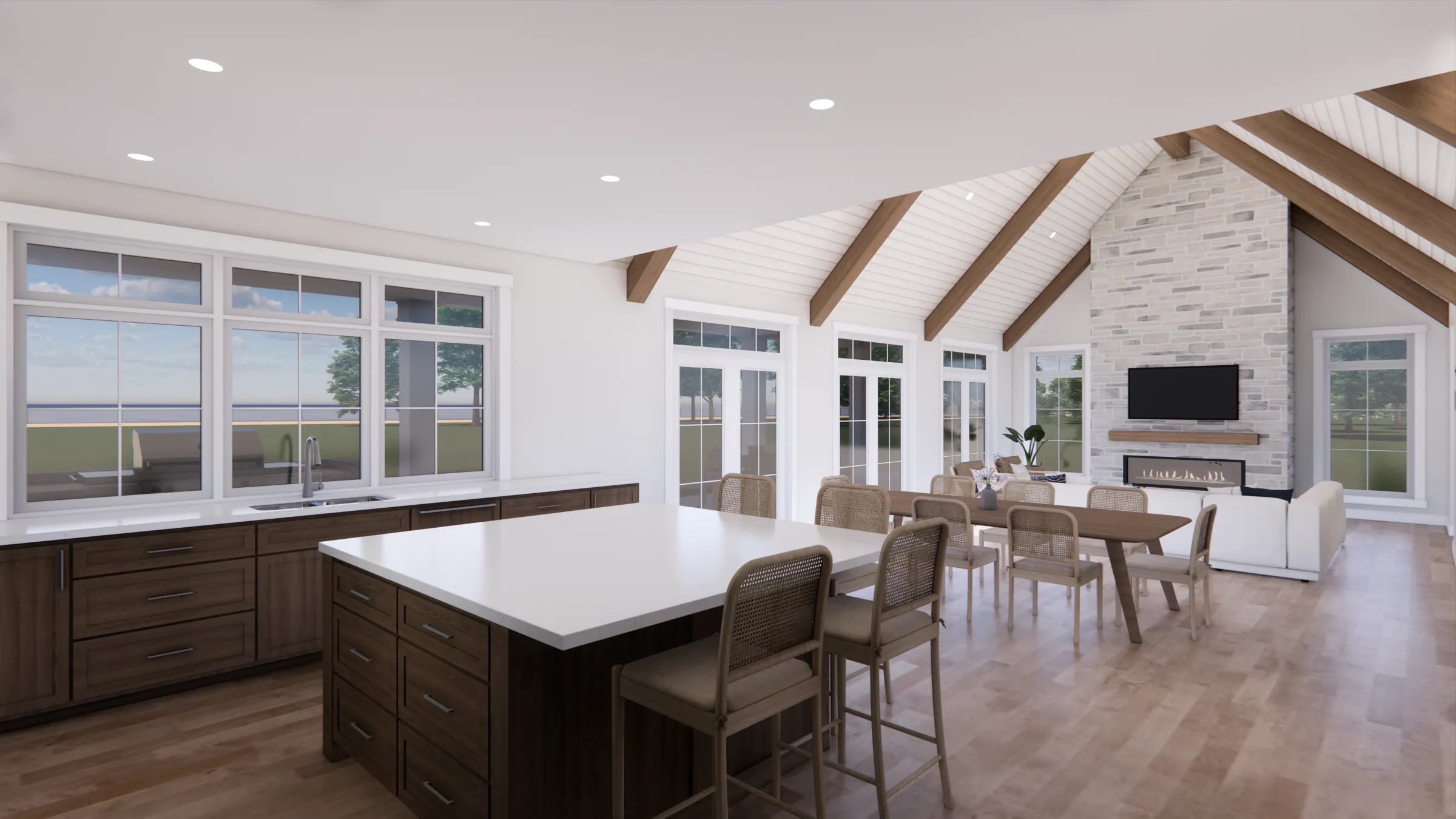 Emily Featherstone Architect designed the home to respond to the site’s natural beauty, using expansive glazing, durable materials, and clean contemporary forms. The result is a modern lakeside retreat that balances style with everyday functionality.